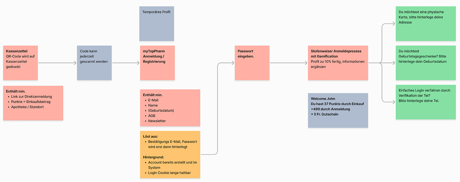 Die im Workshop erarbeiteten Lösungsansätze wurden in konkrete Userflows und Wireframes überführt. Im Zentrum standen die drei Hauptszenarien: Registrieren, Anmelden und Bons einlösen. Die Konzepte wurden anschliessend mit den Stakeholdern von TopPharm anhand von Szenarien validiert und in einem weiteren Schritt mit den Apotheken abgestimmt. Darauf aufbauend erarbeitete ich ein Testkonzept für ein unmoderiertes User Testing mit Maze.