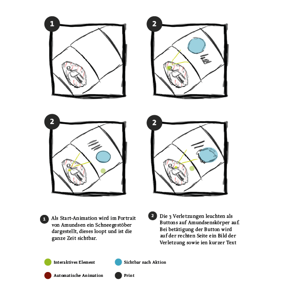 Als Startanimation wird im Portrait von Amundsen ein Schneegestöber dargestellt. Die roten Buttons auf Amundsens Körper informieren den Besucher über die Verletzungen, welche er auf der Reise erlitt. Ergänzend dazu erscheint auf der rechten Seite ein entsprechender Text mit Bild.
