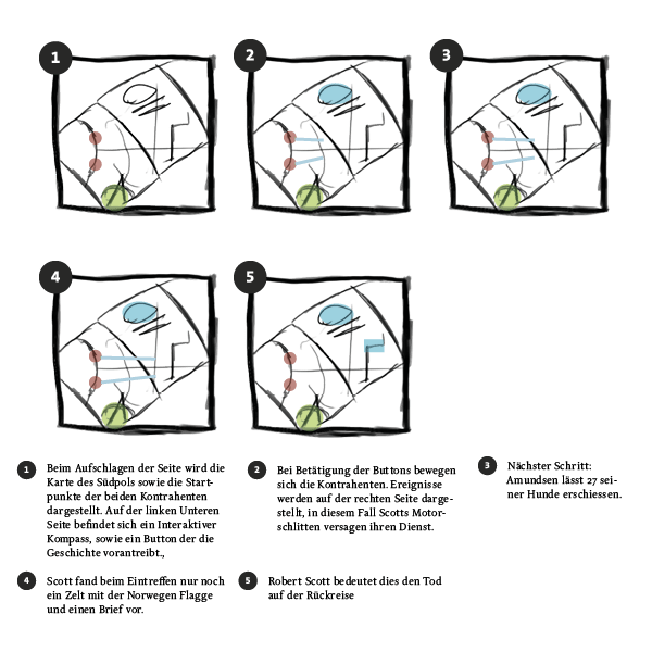 Beim Aufschlagen der Seite werden die Karte des Südpols sowie die Startpunkte der beiden Kontrahenten dargestellt. Auf der linken unteren Seite befindet sich ein interaktiver Kompass, der als Navigation der Geschichte dient. Auf der rechten Seite findet der Besucher eine Beschreibung mit Bild vor.