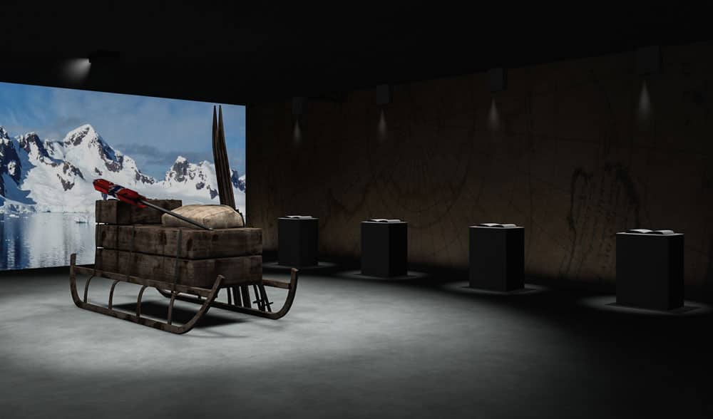 Mit dem Raumkonzept möchten wir die Besucher in die vergangene Zeit versetzen und sie ein Stück Geschichte miterleben lassen. In der Mitte steht das Fortbewegungsmittel von Roald, ein Schlitten, welcher den Betrachtern die begrenzten Mittel jener Zeit aufzeigen soll. An der linken und der rechten Wand hängen die Karten des Nord- und des Südpols. Entlang dieser Pläne sind jeweils vier interaktive Bücher platziert, die die Geschichte erzählen. An der Raumfront projiziert ist ein Video des Südpols mit seiner unglaublichen Landschaft. Im Ein- und Ausgangsbereich sind drei Exponate mit der originalen Ausrüstung des Forschers ausgestellt.