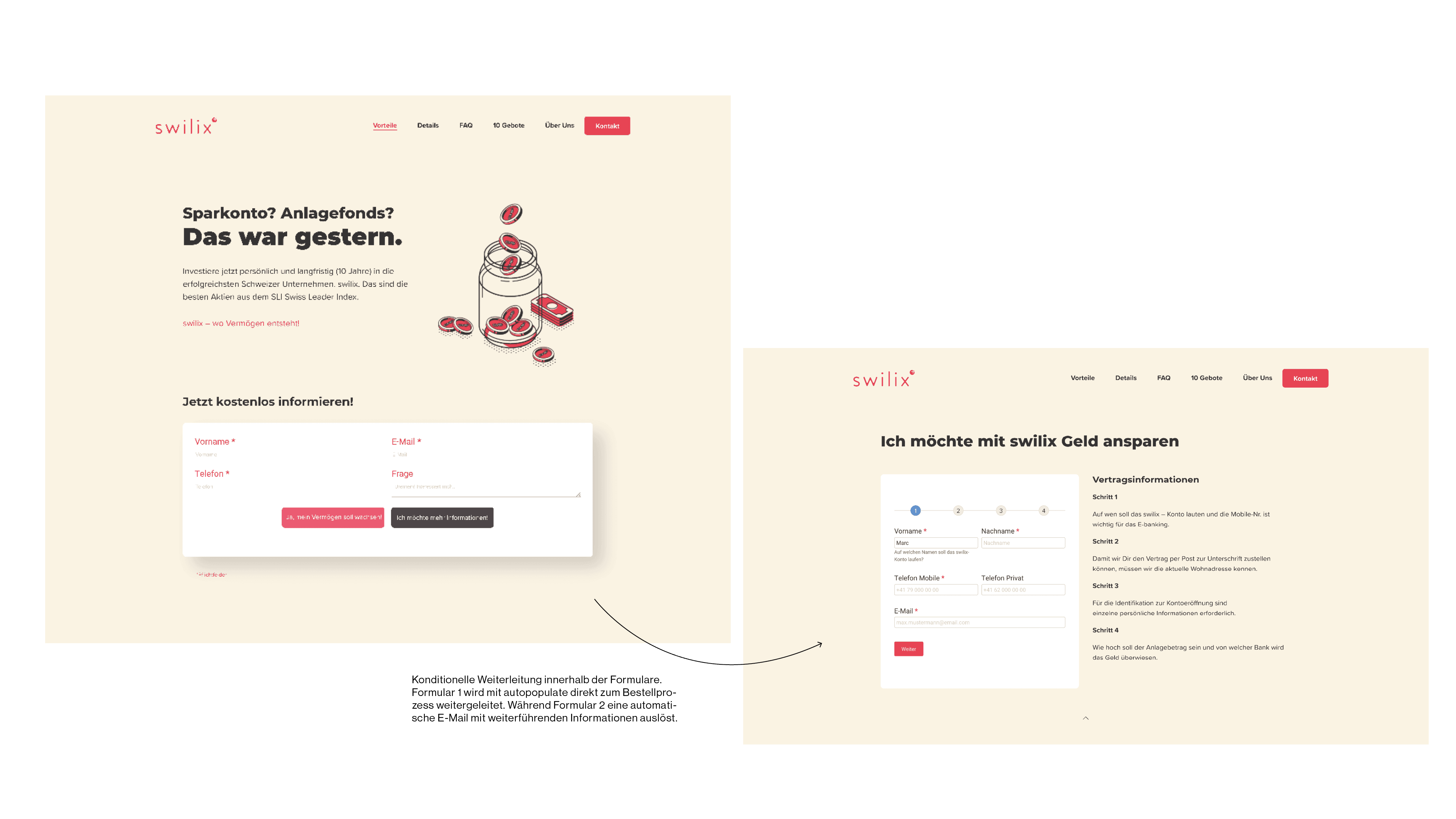 Technisch spannend sind in diesem Projekt die konditionellen Formulare, welche E-Mails basierend auf Abhängigkeiten der angegebenen Inhalte auslösen können und auf entsprechende Formulare im Customer Journey weiterleiten. Das Formular wird je nach Auswahl mit autopopulate direkt zum Bestellprozess weitergeleitet oder aber es wird basierend auf den angegebenen Daten eine automatische E-Mail mit weiterführenden Informationen ausgelöst.