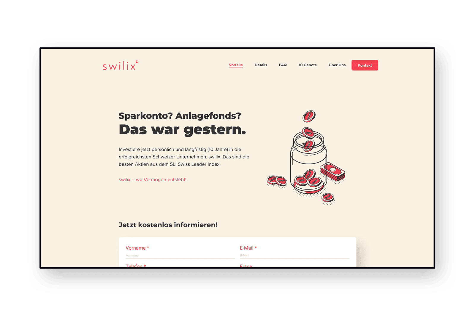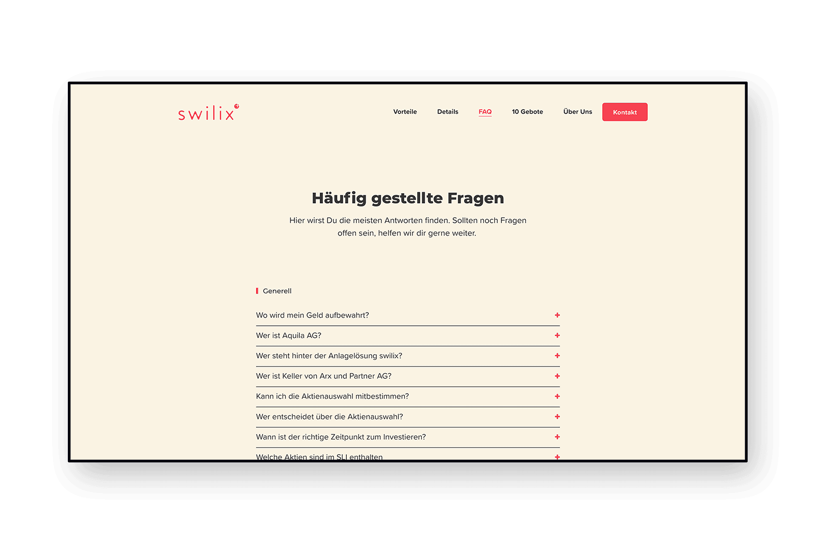swilix.ch soll als sichere und vor allem langfristige Anlagemöglichkeit dargestellt werden. Der Fokus liegt auf den Schweizer Aktien, die bei schlechter Perfomance ausgetauscht werden. Dadurch wird das Risiko für den Kunden minimiert. Das Erscheinungsbild durfte nicht zu verspielt, aber auch nicht zu ernst sein – ein guter Mix, welcher der Zielgruppe eine auf sicheren Werten basierende Anlagemöglichkeit verspricht.