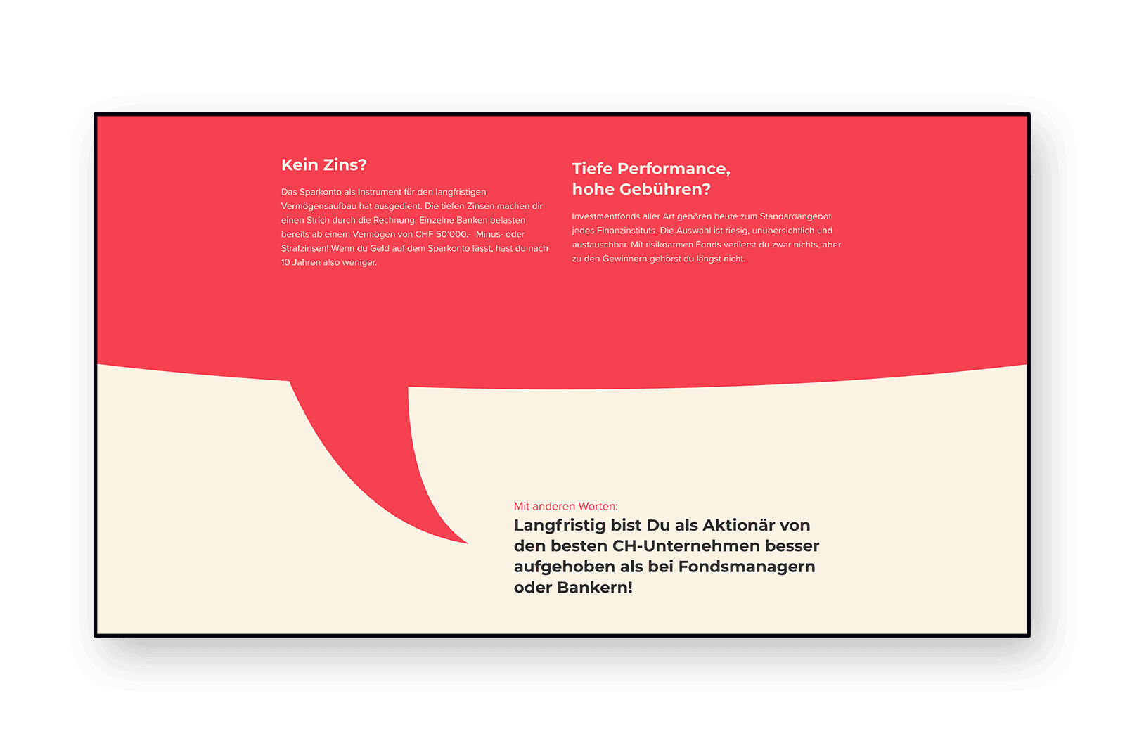 Ursprünglich gewünscht war eine OnePage-Lösung. In einem Workshop konnten wir gemeinsam erarbeiten, dass eine umfassendere Website im Finanzbereich mehr Vertrauen erweckt. Durch kurze Rollenspiele konnten wir feststellen, dass beim Thema Finanzen viele Fragen entstehen, welche auf der Website beantwortet werden können.
